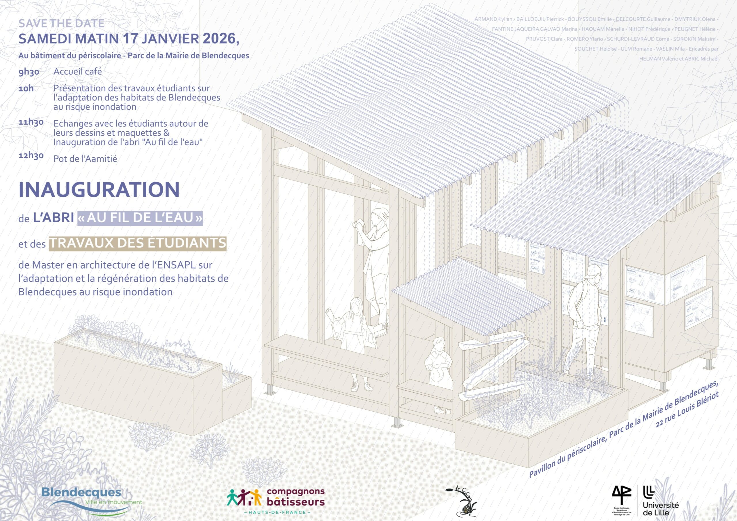 – L’inauguration de l’abri « Au fil de l’eau » réalisé par les étudiants et les Compagnons Bâtisseurs des Hauts de France