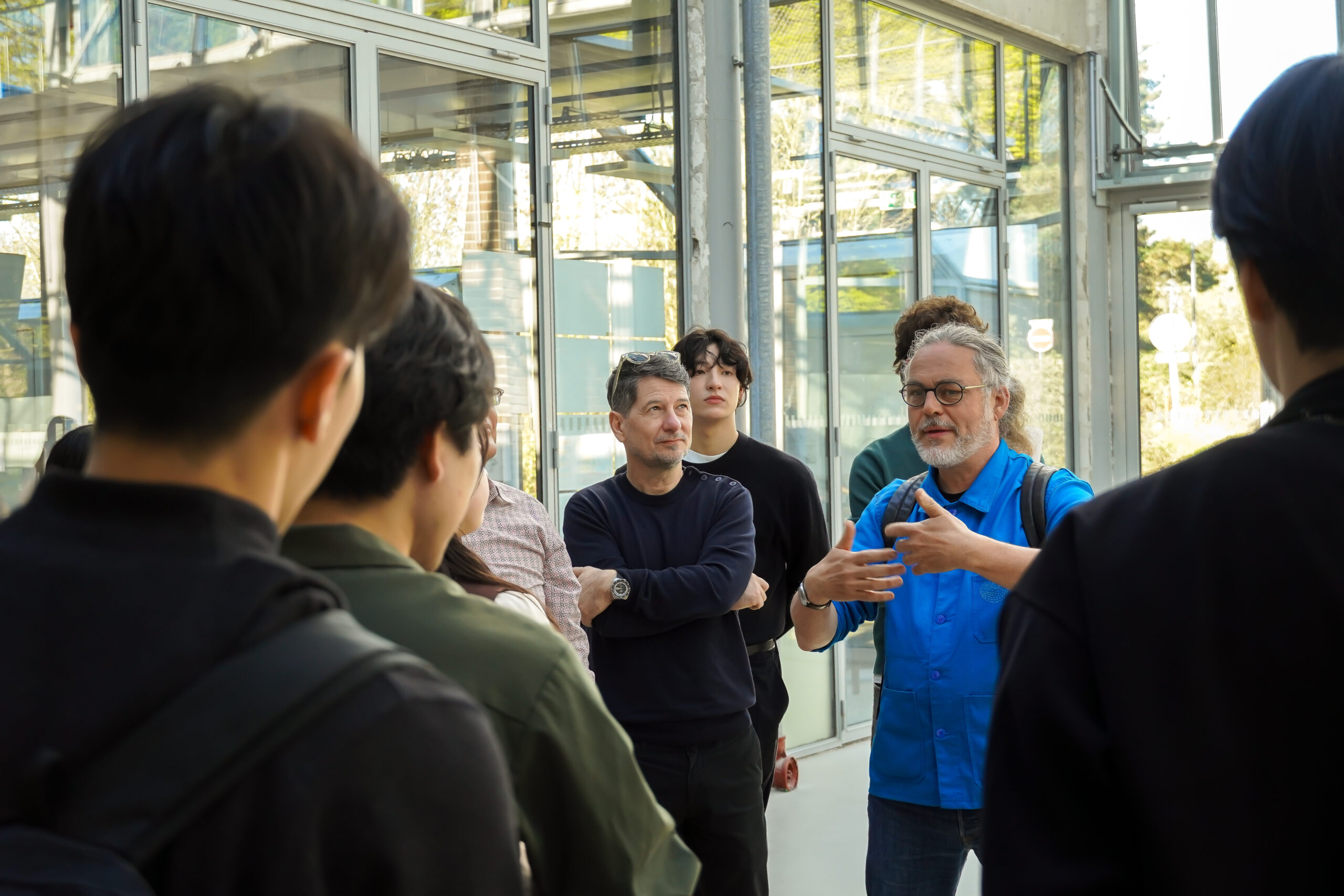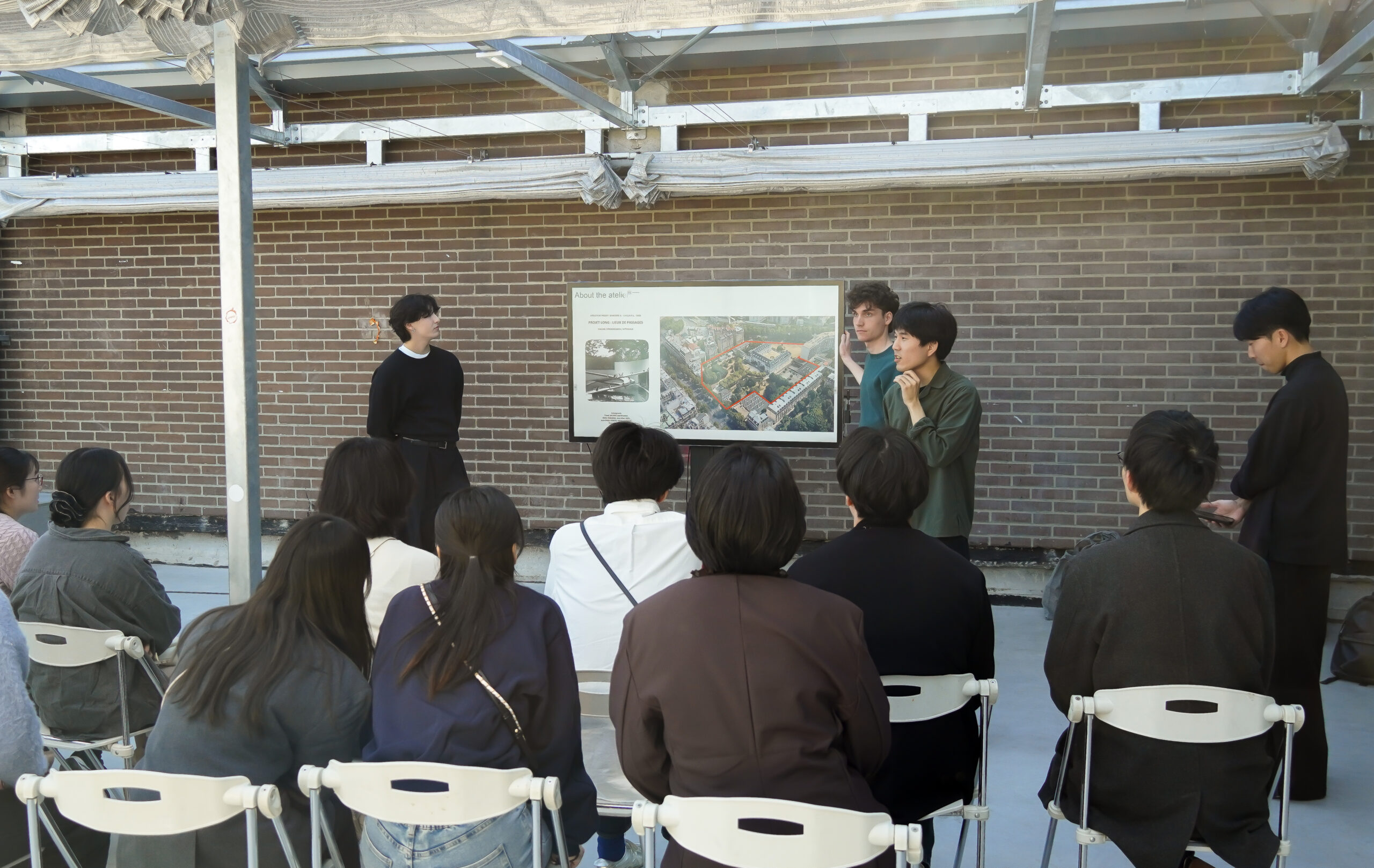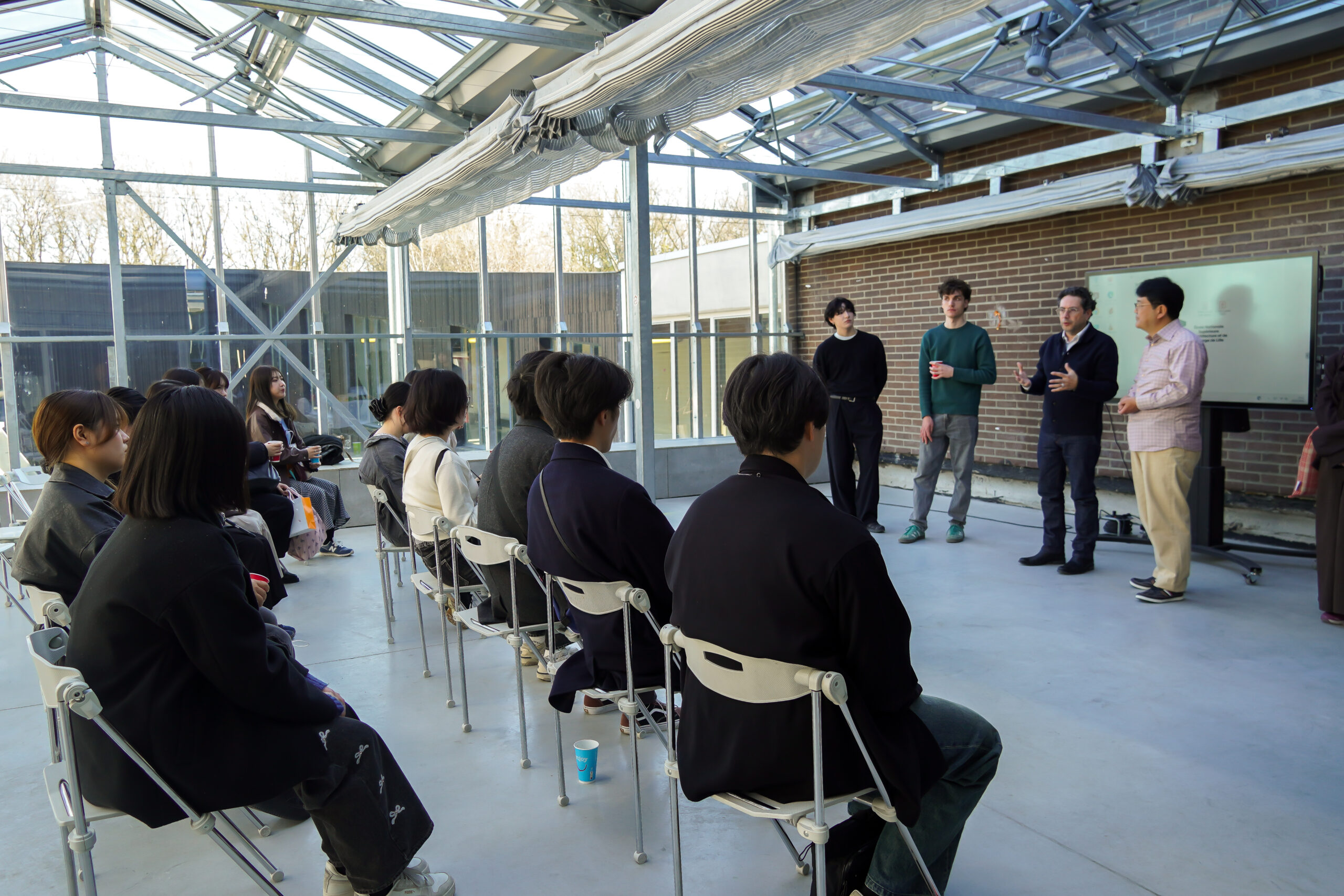 Après une allocution de bienvenue et une présentation institutionnelle de l’établissement par notre directeur, Pablo Lhoas, nos hôtes ont pu découvrir l’école et ses différents cursus. Cette immersion a été rythmée par une visite guidée et des présentations de projets animées par trois de nos étudiant·es — Ferdinand Avice de Bellevue Turqueville, Tom Ama Tamang Syangba et Mari Hirota — secondés par deux étudiants tokyoïtes en mobilité à l’ENSAPL, Tomoki Uemura et Ryo Masuda. Les enseignants Denis Delbaere et Cédric Michel ont également apporté leur expertise en représentant respectivement les formations Paysage et Architecture.